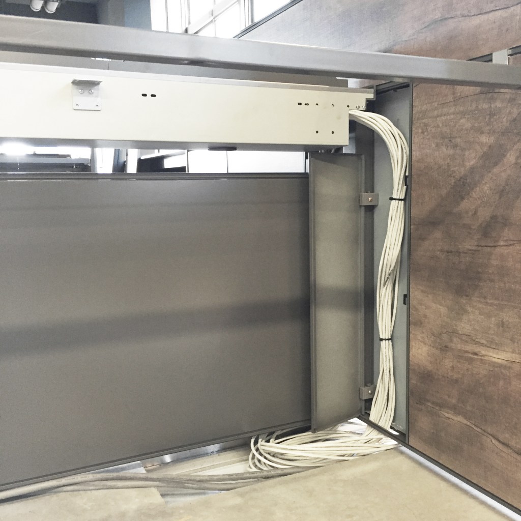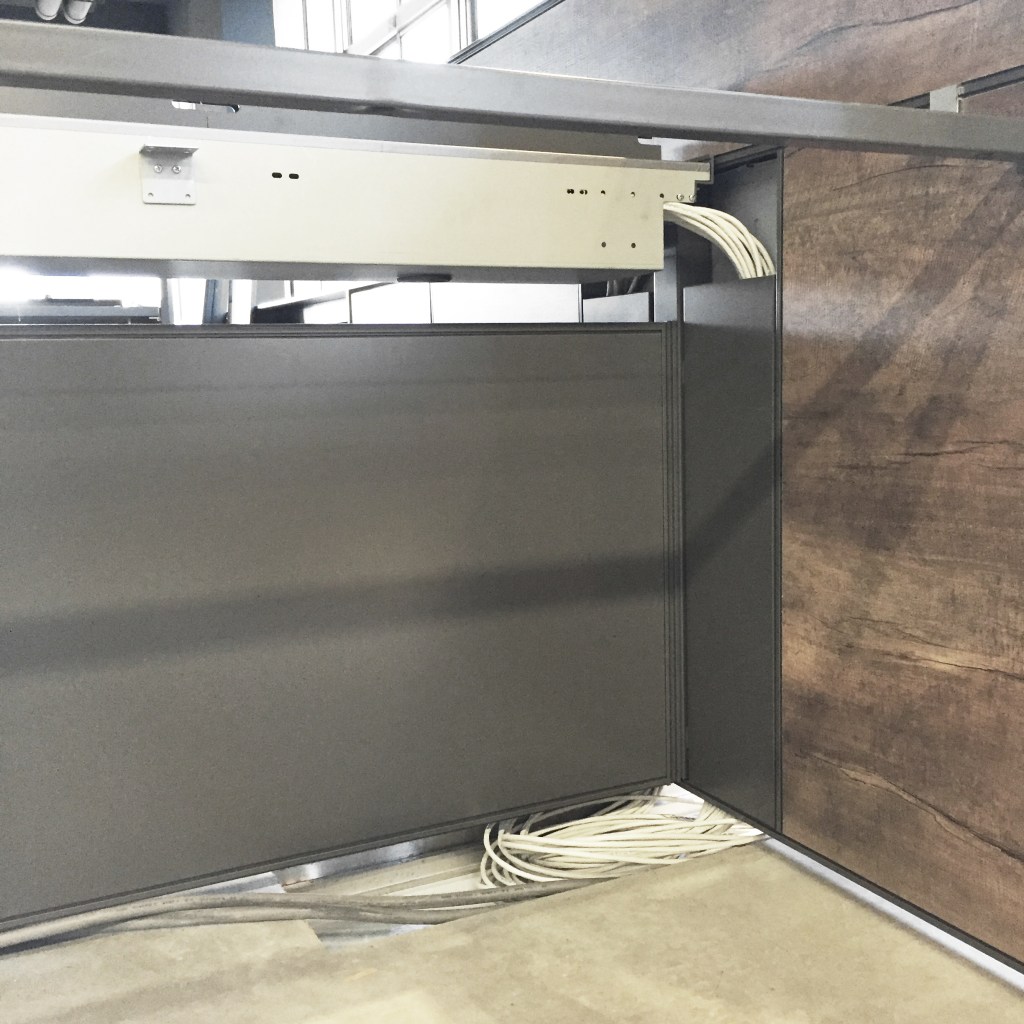 因應科技公司的用電需求,每個工程師或多或少都需要兩台主機或雙螢幕,再加上手機等其他週邊設備,每個座位都配有5組插座板(桌上3組/桌下2組),桌上插座主要是提供給螢幕、筆電、手機等放在桌上或常需要移動收納的設備,桌下插座則是給主機使用,大量的線路完全收納在桌上線槽及桌腳中。