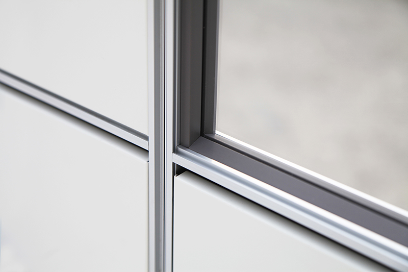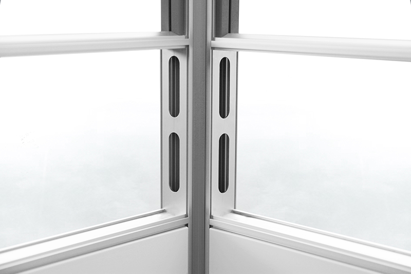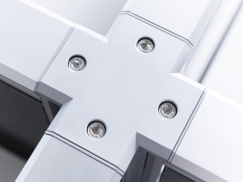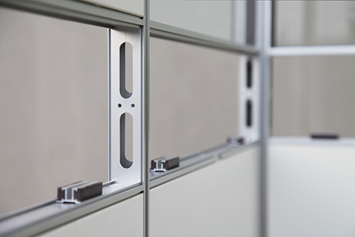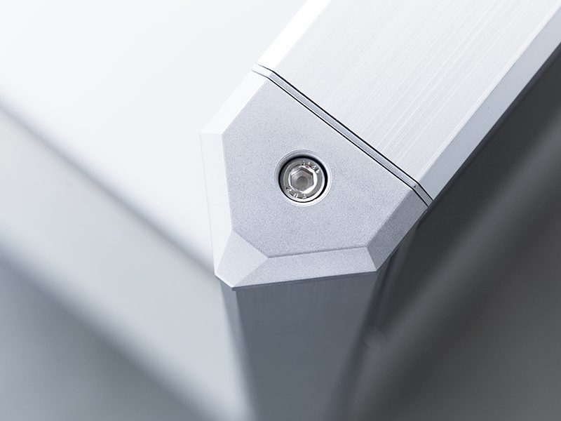 稜角處理可呈現出鋁合金擠型特有的金屬反射感,帶出俐落的線條,而鍍鎳的 M5 內六角機械螺絲除了做為轉接件的點綴外,並同時用來固定上蓋、收邊與屏風體,使整體屏風結構平整密合而穩固。