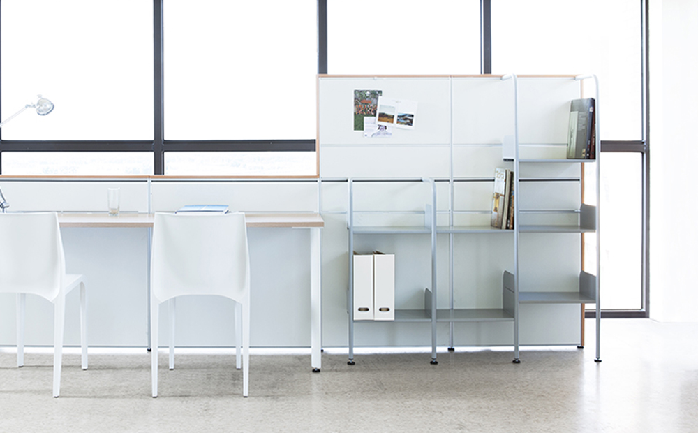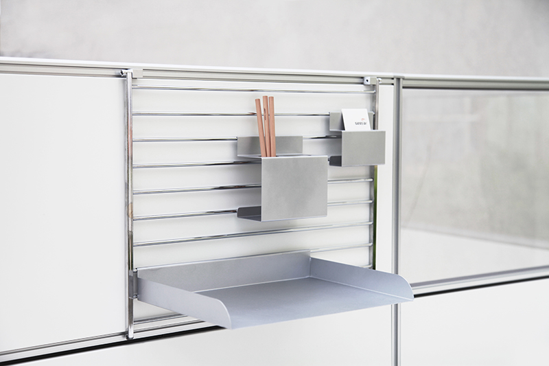可自由改變掛裝位置的活動書架、名片架、筆架及置物盤。