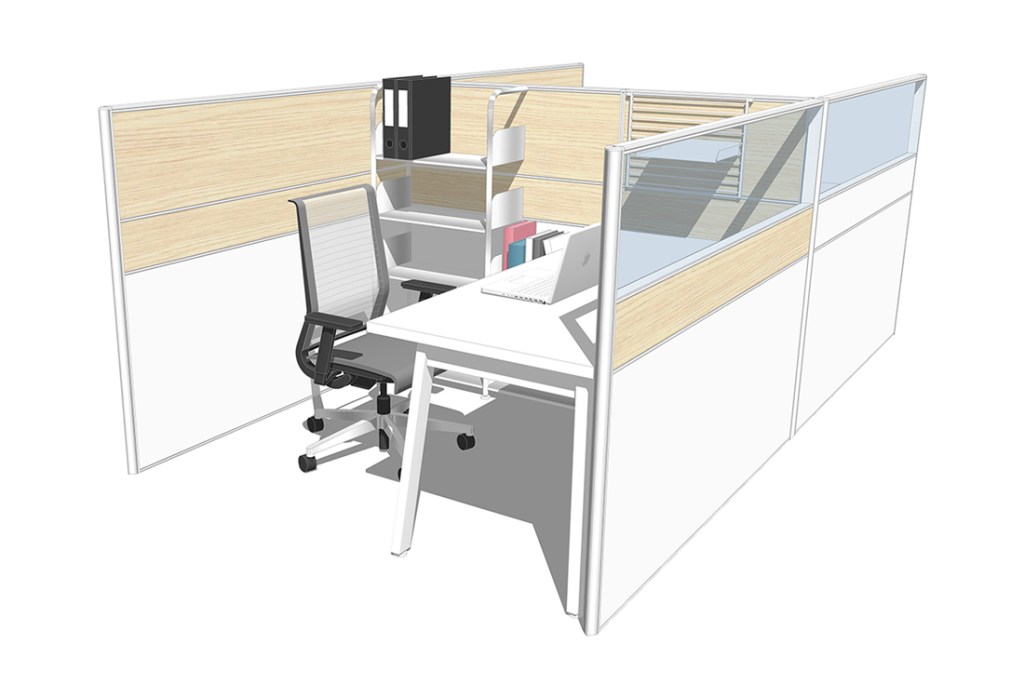 側邊以開放式書架取代檔案櫃及側桌傳統格局,但書架深度淺,工作範圍更大